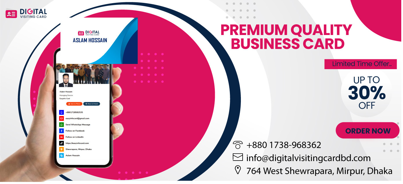 ডিজিটাল বিজনেস কার্ড ব্যাবহার করে সবার থেকে আলাদা হয়ে উঠুন! আপনার ছবি, কোম্পানির লোগো, পণ্য ও সেবা, পোর্টফোলিও যুক্ত করুন এবং আপনার ব্র্যান্ডের সাথে মানানসই বিভিন্ন কাস্টমাইজেবল ডিজাইন করুন। নতুন চাকরির পদবি বা ফোন নম্বর পেয়েছেন? কোনো চিন্তা নেই ওয়েব-প্রফাইল থেকে আপনার কার্ড যেকোন সময় আপডেট করুন।